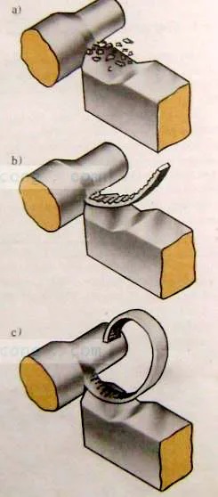 Khi cắt vật liệu dẻo, người ta phân biệt các giai đoạn hình thành phoi như sau. Khi mới bắt đầu cắt, dao và chi tiết tiếp xúc với nhau (hình 2 a). Sau đó lưỡi dao ăn sâu vào kim loại làm kim loại bị dồn (hinh 2 b). Sự lún sâu của lưỡi dao vào kim loại sẽ thắng lực liên kết giữa lớp kim loại bị hớt đi và phần kim loại còn lại (kim loại chính). hiện tượng này dẫn đến sự trượt phần tử phoi đầu tiên (hình 2 c)
